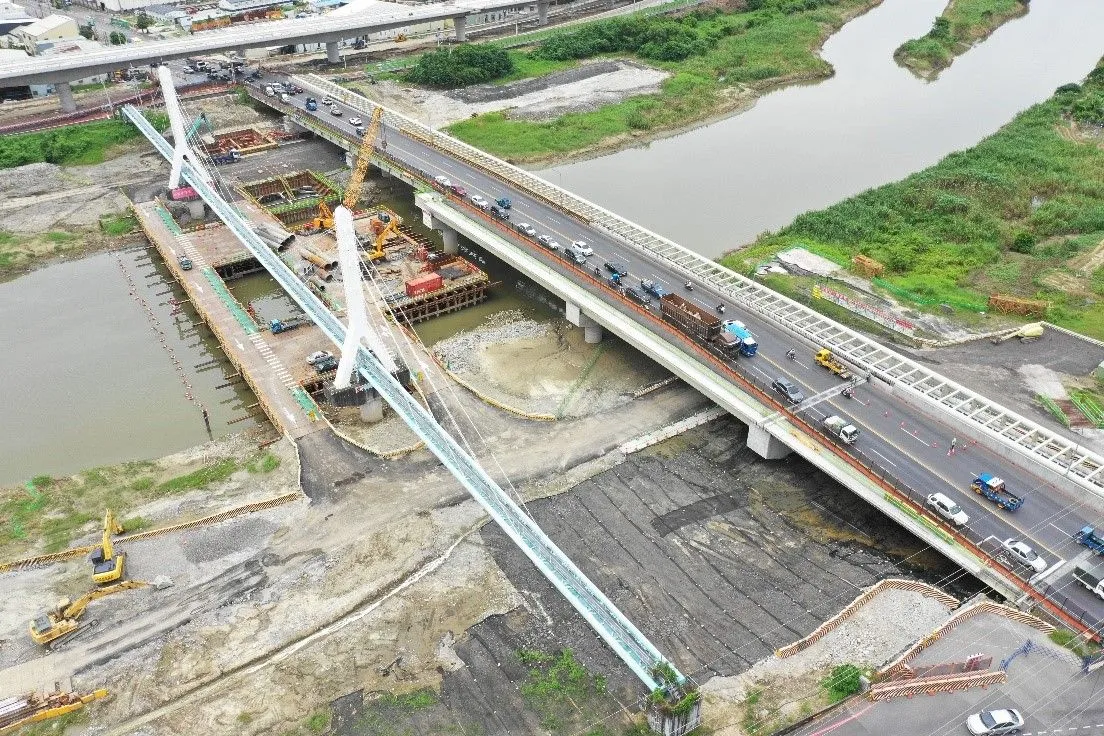 本工程於設計階段即妥善辨識施工風險,於設計上除採用預鑄吊裝工法外,亦採用施工性佳橋型方案(鋼板梁+鋼箱梁橋)並加大跨距、減少落墩降低鄰水作業風險,並配合採用半半施工吊裝避免交通衝擊,提升施工安全性。