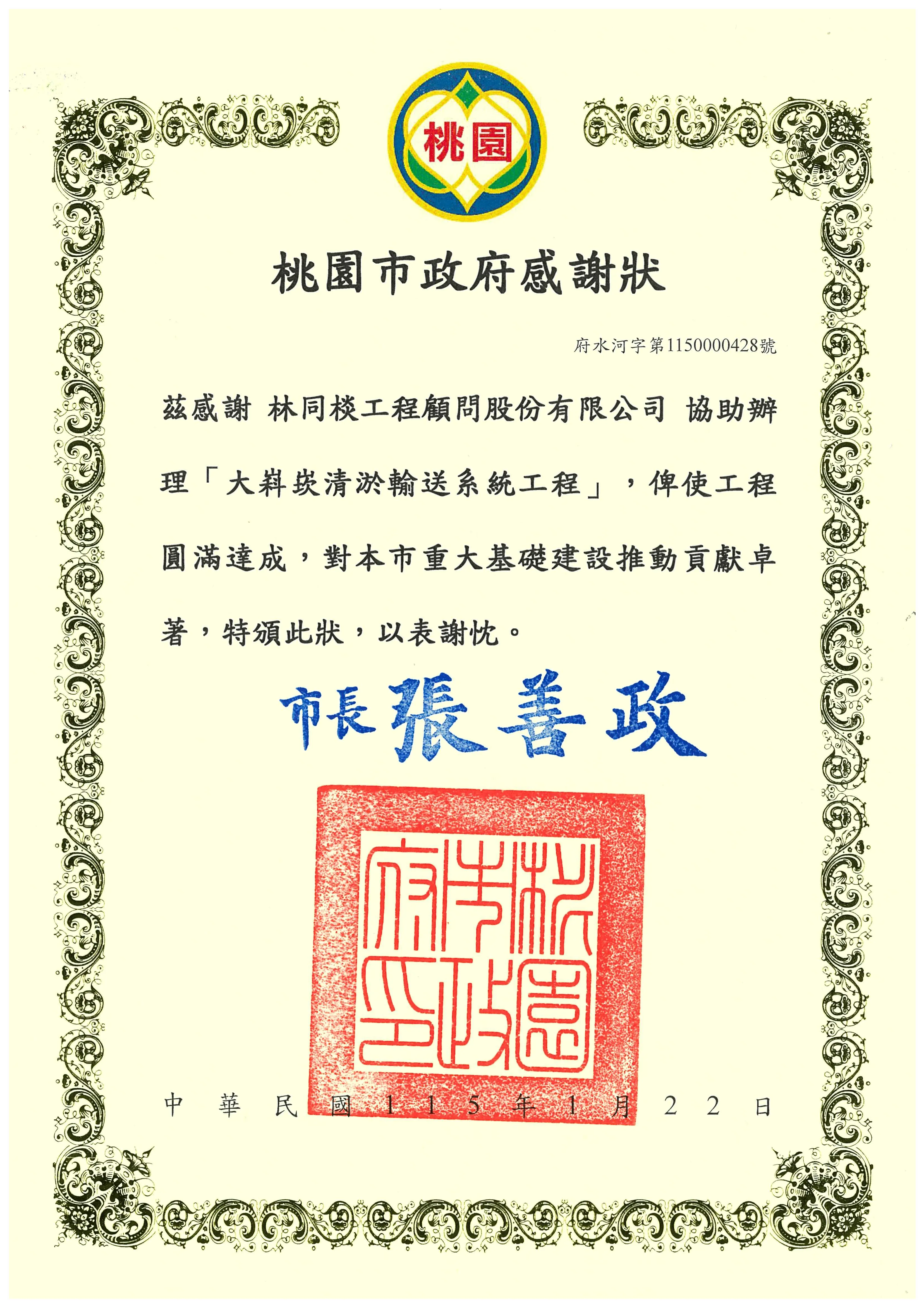 115年度桃園市政府感謝狀