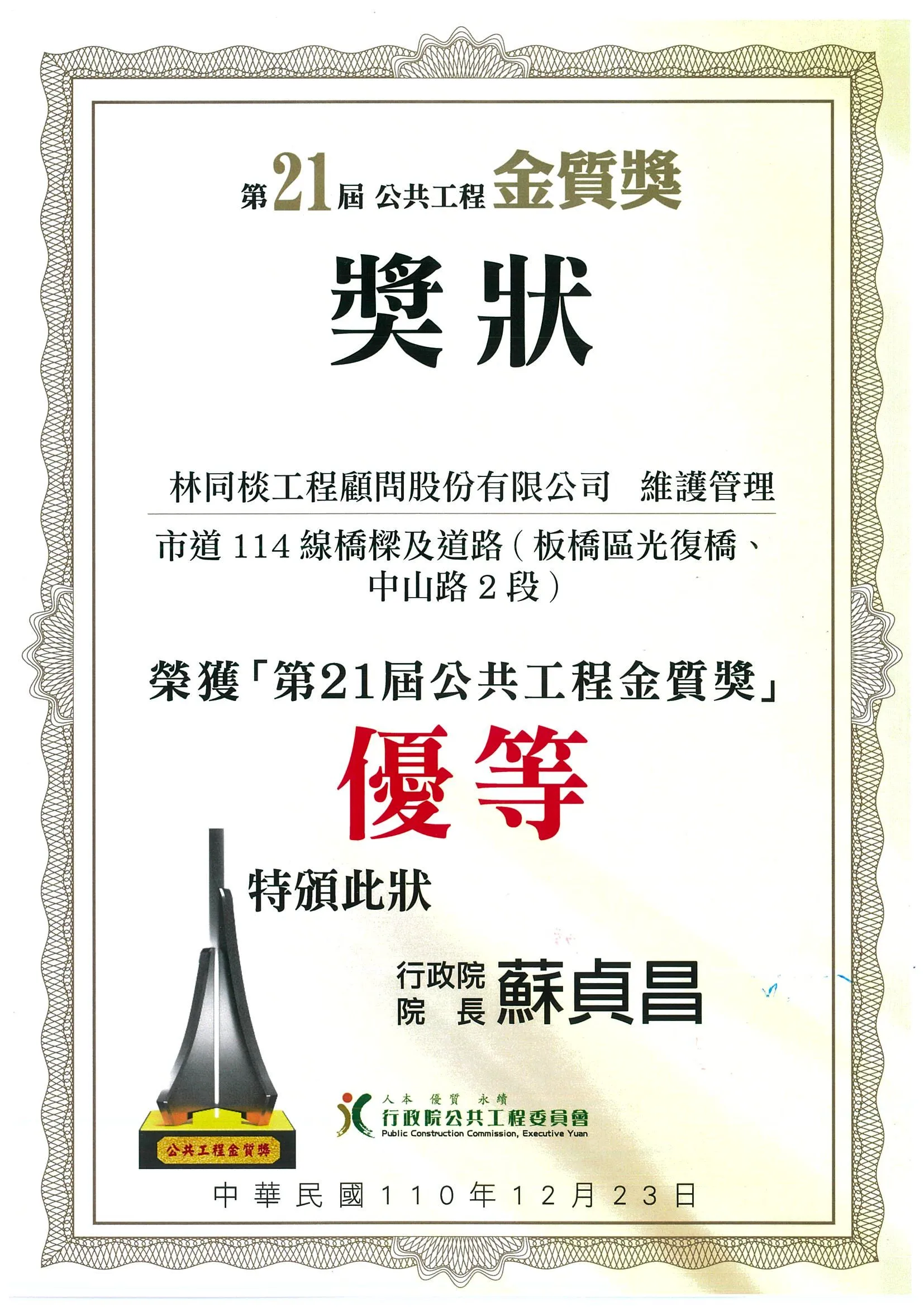110年度第21屆公共工程金質獎-公共設施維護管理獎(地方2類)
