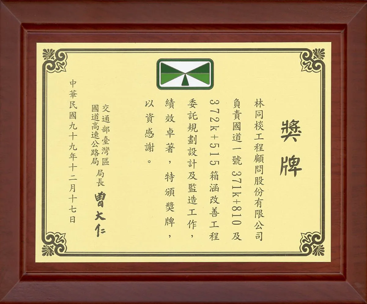 099年度國道一號371k+810及372k+515箱涵改善工程績效卓著感謝獎牌