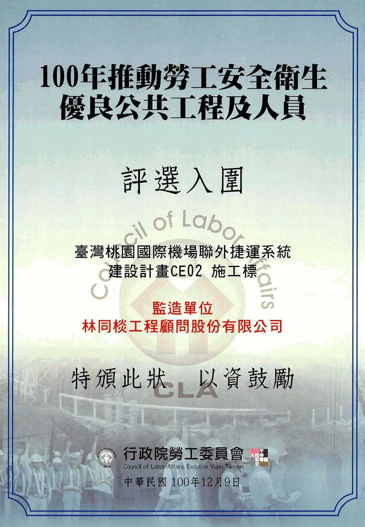 100年度推動勞工安全衛生優良公共工程及人員選拔獲選優良工程[功在苗栗]