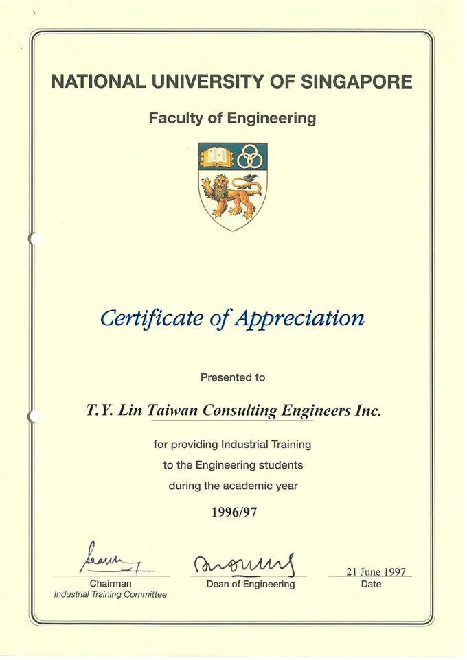 1996年度NATIONAL UNIVERSITY OF SINGAPORE Faculty of Engineering感謝狀[實習]