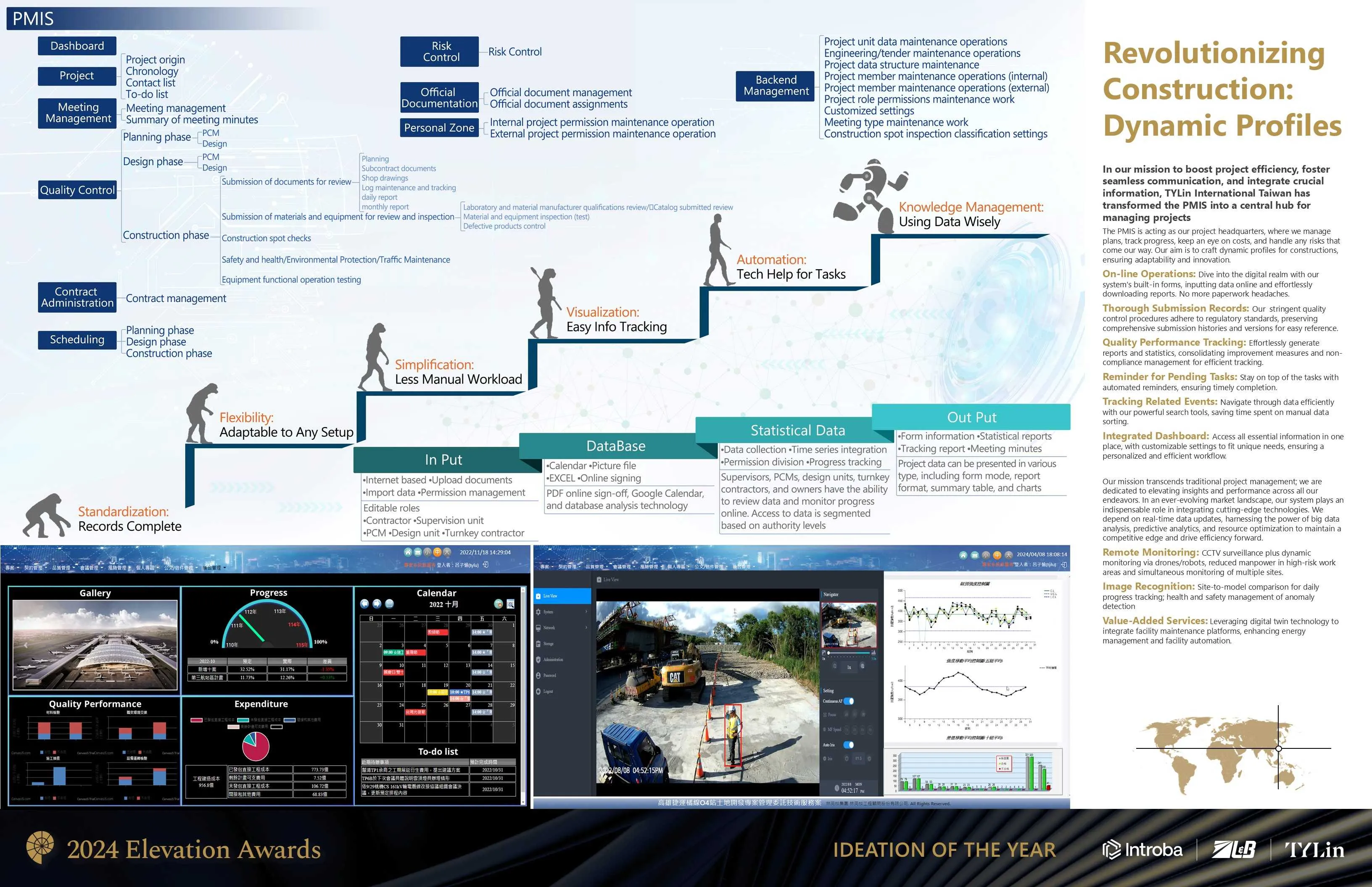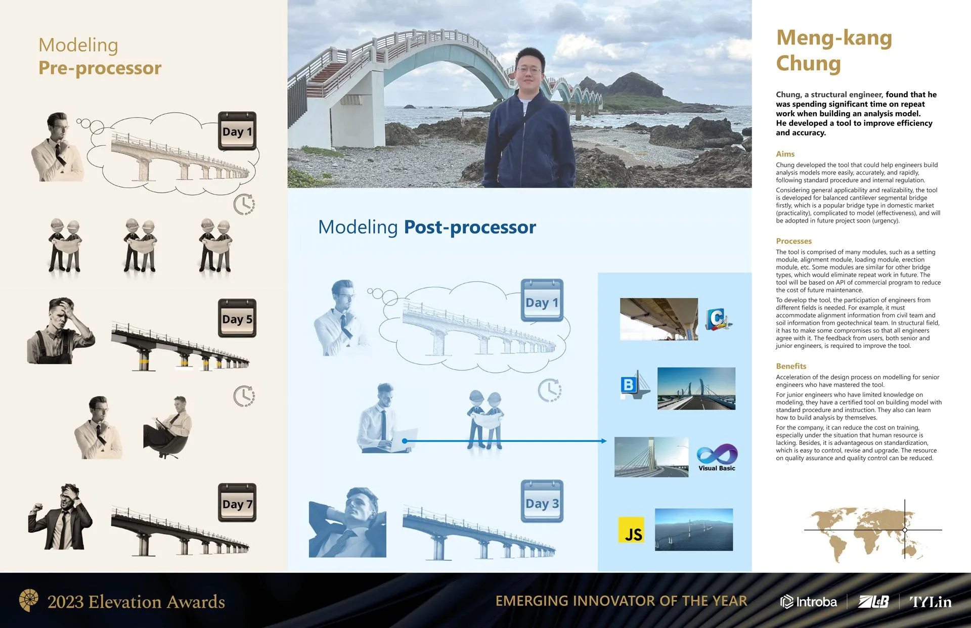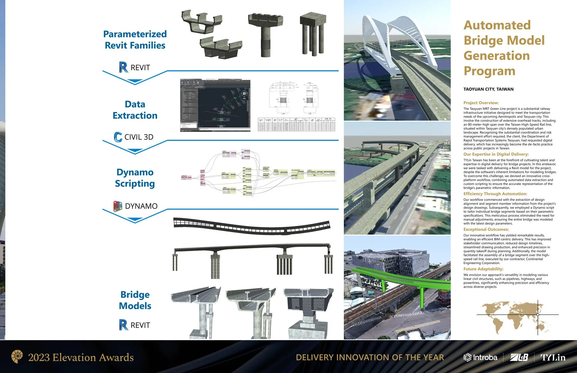 林禮賢經理於本公司任職逾十五年,推動公司由傳統 2D 設計邁向 BIM 數位化。他成立核心團隊,導入 Civil 3D、Revit、Tekla 等系統,並開發自動化工具(如 Revit API、Dynamo),使橋梁與管線建模自動化,大幅提升效率。其成果曾榮獲 2017 BIM 技術卓越獎及 2021 工程數位創新競賽獎。他亦創建「TYLin 知識平台」,整合教育訓練、元件共享與知識管理,推動 LiDAR、IoT、VR/AR 等新興技術應用。